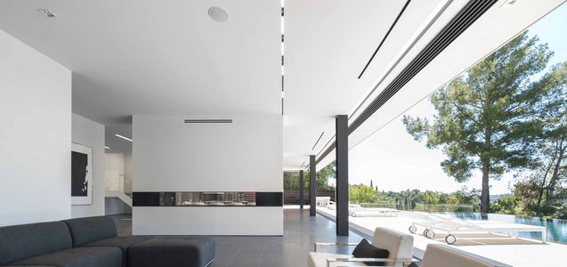 entrance to an interior courtyard. The backside opens to a cantilevering swimming pool and is completely porous to the stunning canyon view. The project followed a tight timeline of six